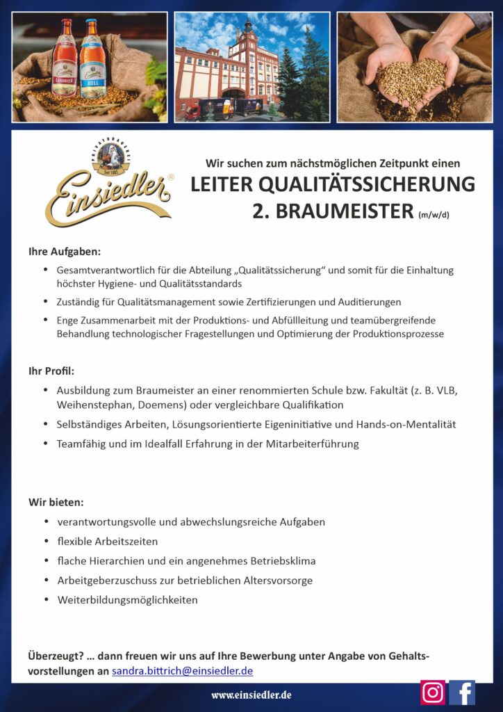 Mitarbeiter Marketing / Public Relations und Assistenz der Geschäftsleitung / 2. Braumeister und Leiter Qualitätssicherung